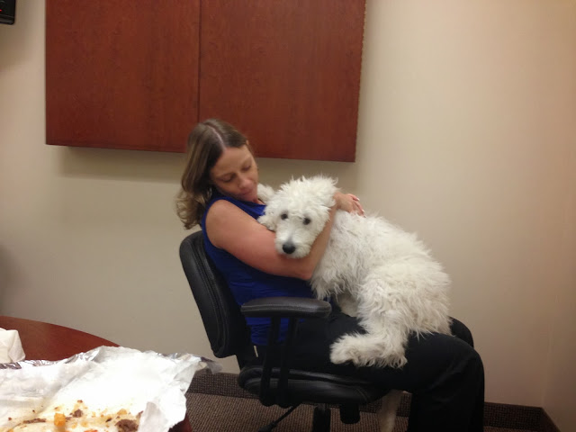 I took Bella to the office of a friend this week for a visit. I was a little nervous. It was her first big outing other than going to the groomer and puppy classes here in town [if you don't count her trip to the ER which I would rather forget].