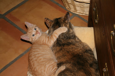 Funny story about our Chaz meetup: We had been looking for a while for a kitten to be a companion for Riley. But the right kitten wasn't appearing. We had already decided against 2 other cats. On the way to meet the man who was offering Chaz, John kept reminding me that we needed to not just accept any kitten. It had to be the "right" kitten. I agreed.We arrived at the apartment complex and phoned the man that we were in the parking lot. He said he would be right down. John and I paced in the lot. I remember John was a few yards away from me when all of a sudden I heard "Awwwww" and saw my husband - the one who was so skeptical and promised to be the careful one - reaching out to this little orange furball and cradling him. Chazzie had found his forever home. He and Riley became instant friends from that day forward.